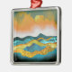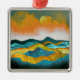 Abstrakte Landschaft von einer Bergvista mit sanften Hügeln und einem Regensturm in Orange, Gold, Blau und Cyan.
