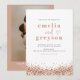 Diese Hochzeitseinladung beinhaltet Imitate Rose Gold Glitzer Sequins und ein lustiges Glam Layout. Verwenden Sie diese Vorlage, um die Schriftart, die Farbe des Schriftartes und die Hintergrundfarbe entsprechend den Anforderungen des Ereignisses zu bearbeiten. Bearbeiten Sie *die meisten* der Formulierung, um Ihren Veranstaltungsstil besser anzupassen. Fügen Sie Ihr eigenes Foto auf die Rückseite für eine persönliche Touch