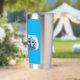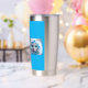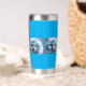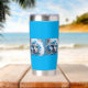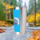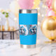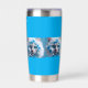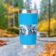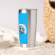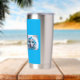 This insulated mug is blue with a pretty white cat with blue eyes, attractive and practical