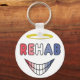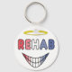 Rehab Angel Design hat das Wort "REHAB" mit einem Halo oben und einem großen Grinsen unten. Das Wort und das Lächeln sind in vage Rot, Weiß und Blau schattiert. Eine coole Grafik mit einer glücklichen, positiven Botschaft über den Nutzen von Rehabilitation und Erholung.