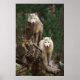 In einem ruhigen Wald stehen zwei weiße Wölfe auf einem gefallenen Baumstumpf, ihr Fell ist durch den jüngsten Regen verschlungen. Trotzdem bekommt ihre Anwesenheit Aufmerksamkeit, die Stärke und Gnade ausstrahlt, während sie ihre Domäne mit wachsamen Augen und posierten Haltungen untersuchen.