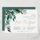 Die elegante Fledermaus-Mitzvah-Einladung umfasst Aquarellfarben-Eukalyptus-Blätter und grüne Blattkaskade aus der oberen links Ecke, die mit Goldfolienakzenten der Rose geschmückt ist. Personalisieren Sie mit Ihrer Tempelzeremonie und Feiern Details auf der rechten Seite ausgerichtet. Die Karten werden zu einem festen Waldgrün umgeschaltet.