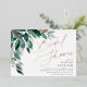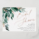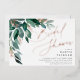 Die elegante Brautdusche mit Aquarellfarben-Eukalyptus-Blätter und grünem Blattwerk aus der oberen links Ecke, die mit Akzenten aus Rose und Goldfolie geschmückt ist. Personalisieren Sie Ihre Brautparty-Details, die auf der rechten Seite ausgerichtet sind. Die Karten werden zu einem festen Waldgrün umgeschaltet.