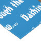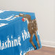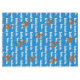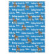 Niedlicher handgemalter Karikaturencharakter Super Snow, der blau-mit Augen Rentier mit weißen Flecken und das Aussehen der rot-blauen, funkelnden Nase tanzt durch den blauen Hintergrund. Original Rentier Artwork Design © TamiraZDesign.