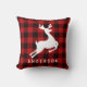 Das quadratische Urlaubskissen verfügt über ein Monogramm Ihres Nachnamens (oder eines anderen Textes) mit einem karierten Büffel-gemusterten Rahmen in Rot und Schwarz-Karo und einer Silhouette mit weißen Rentieren.