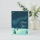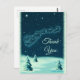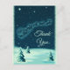 Ein Weihnachtsschein danke Ihnen Postkarte mit einer Vintagen Abbildung, wie der Weihnachtsmann in seinem Schlitten von seinen Rentieren gezogen wird. Kleine Sterne sprinklen den Nachthimmel. Schneebedeckte Kiefernbäume auf dem Boden. Vintages Retro-Gefühl.