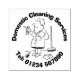 Die Cartoon-Illustration zum Thema Hausreinigung zeigt eine Dame mit Reinigungsausrüstung. Personalisieren Sie es mit Ihrem Firmennamen und Ihrer Kontaktnummer. Ideale Briefmarke für Hausreiniger oder Hausreiniger.