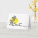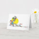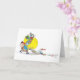 Diese Reise-Grußkarte kennzeichnet ein Kind, das einen sehr vollen Rucksack trägt, der mit Spielwaren angefüllt wird und einen kleinen Koffer, das schleppt.