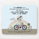 Der kleine Junge wird auf einer Schotterstraße gesehen, wie er mit dem Fahrrad fährt. Steine und Gräser sind entlang des Weges. Eine große Sonnenblume und ein Regenbogen in der Ferne bringen Schönheit auf seine Reise. Aus dem Zitat von David A. Carrizales werden wir daran erinnert, die Schönheit auf der Reise zu sehen, weil es ein Geschenk Gottes ist. Diese Abbildung ist von Christie Black.