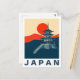 Unternimm eine Reise in die Vergangenheit mit diesem atemberaubenden Vintage-Reiseplakat von Japan. Das Design zeigt eine ikonische mehrstöckige Pagode im Vordergrund, vor dem beeindruckenden Bild einer riesigen roten Sonne, die über einem majestätischen Berg aufgeht, der stark an den Berg Fuji erinnert.