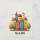 Diese Reisepostkarte zeigt eine charmante Illustration einer farbenfrohen Stadtlandschaft mit skurrilen Häusern in verschiedenen Formen und lebendigen Farben, ähnlich wie die schöne estnische Hauptstadt Tallinn.
