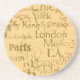 Spaß-Untersetzer, getan in einer Beige, mit hellbraunem Text ganz vorbei, große Städte der Welt auflistend. Ein großer Untersetzer für Höhle, Spielraum oder Familienraum. Vervollkommnen Sie für das Hinzufügen eines Gesprächsstoffs Ihrem Kaffeetische und macht ein nettes Geschenk.