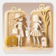 Reiseaufkleber. Pappkarton, wie eine Illustration von Kindern, die mit einem riesigen Koffer und Gepäck reisen. Seltsam. Spaß.