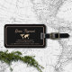 Die Einfachheit eines eleganten und modernen schwarzen Tags mit einer kleinen Weltkarte an der Vorderseite und einem Flugzeug an der Rückseite... mit Feldern für Namen und zusätzliche Informationen (Adresse, Telefonnummer und E-Mail)...