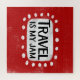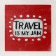 "Travel Is My Jam" ist ein lustiges Textdesign mit weißer Akzent-Form, umgeben von weißen, weißlichen, weißlichen, weißgestrichenen Punkten.