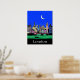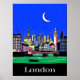 Print in einem pulsierenden Londoner Stadtbild wird unter einem sternförmigen Nachthimmel dargestellt, mit ikonischen Sehenswürdigkeiten wie Big Ben silhouetted gegen das Blau. Über der Skyline hängt ein Halbmond, während eine Brücke den Fluss überquert.