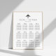 Direkt an den Tischen Ihrer Hochzeitsreise mit diesem einzigartigen Sitzplan, der anstelle von Tischnummern die Flughafencodes enthält. Das einfache Schwarz-Weiß-Design bietet Namen und Flughafencodes in elektronischer Form mit Punktschrift, unten sind die Namen Ihrer Gäste aufgelistet. Eine Abbildung des Flugzeugbildes oben rundet das Design ab.