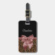 Reise auf Mode mit diesem stilvollen braunen Pelzleopard-Druck-Gepäckanhänger mit einem eleganten rosigen braunen Band gebunden in einen schicken Bogen. Personifizieren Sie diesen modernen und noblen Tierdruckentwurf, indem Sie Ihren Namen addieren. Ebenedruckbild, nicht tatsächlicher Pelz oder Band.
