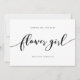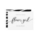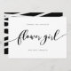 Die stylish Will You Be My Flower Girl-Karte mit den Worten "Blume" in einem entspannenden kursiven Skript in schwarz auf weißem Hintergrund. Die Karte hat eine schwarze Rückseite mit überlappenden weißen Linien. Personalisieren Sie es, indem Sie den Platzhalter-Text ersetzen. Für weitere Optionen, wie zum Beispiel den Schriftart zu ändern und ihn zu vergrößern oder zu verändern, klicken Sie auf den Button "Anpassen". *Bitte beachten Sie, dass das Zazzle-Wasserzeichen, das in der Zoomvorschau angezeigt wird, NICHT auf dem gedruckten Endprodukt erscheint. © Rosewood and Citrus