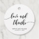Gastgeschenk Hochzeit Tags mit den Worten "Liebe und Dank" in einem entspannenden kursiven Skript in schwarz auf einem weißen Hintergrund. Personalisieren Sie es, indem Sie den Platzhalter-Text ersetzen. Für weitere Optionen, wie zum Beispiel den Schriftart zu ändern und ihn zu vergrößern oder zu verändern, klicken Sie auf den Button "Anpassen". *Bitte beachten Sie, dass das Zazzle-Wasserzeichen, das in der Zoomvorschau angezeigt wird, NICHT auf dem gedruckten Endprodukt erscheint. © Rosewood and Citrus