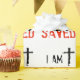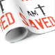 Dieses Ausrüstungsbeschreibungen die christliche Phrase, "ich werde" in den roten und schwarzen Buchstaben, zusammen mit einem schwarzen Kreuz gerettet.