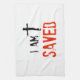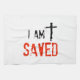 Dieses Ausrüstungsbeschreibungen die christliche Phrase, "ich werde" in den roten und schwarzen Buchstaben, zusammen mit einem schwarzen Kreuz gerettet.