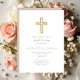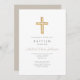 Personalisierte religiöse Cross Taupe Script Boy Taufe Einladung.