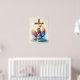 Frohe Ostern mit diesem niedlichen Osterhasen oder Kaninchen, bunten Ostereiern und einem Kreuz.