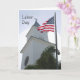 Religious Labour Day Card mit einer weißen Kirche, steeple mit einem Kreuz, Büschen und einer amerikanischen Flagge.