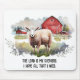 Niedliche Aquarellschaf in einem Bauernhof mit roter Scheune und religiösem Vers. Text ist bearbeitbar.