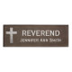 Religiöser ehrenamtlichtitel-ehrwürdiges silbernes Kreuz auf dunklem ledernem Hintergrund mit kundengerechtem Text. Vergessen Sie nicht, Ihren personalisierten Text auf den Entwurf zu setzen. Ein einzigartiger Entwurf und ein großes Geschenk für Sie oder jemand auf Ihrer Geschenkliste. Indem Sie auf "klicken, fertigen Sie es!" besonders an Knopf, den Sie von einer breiten Vielzahl der Schriftartarten wählen können und Größen zur Gewohnheit passen den besseren Namensumbau sogar.