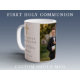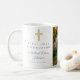 Personalisierte religiöse Cross Boy Erste Kommunion Foto Kaffee Tasse. Teil der Dusty Blue Script Cross Boy First Communion Suite mit passender Einladung, Schreibwaren und erstem Communion Party Zubehör.
