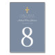 Custom Religious Cross Dusty Blue Boy First Communion Table Number. Part of the Dusty Blue Script Cross Boy First Communion Suite with matching invitation, stationery and first communion party accessories.