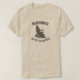 This t shirt features a humorous and bold graphic design centered on the chest. The phrase "REMEMBER TO PUT IN REVERSE" arches above and below a simple black line illustration of a motorized wheelchair. The design uses a clean, minimalist stamp style with a slightly distressed look that gives it a vintage screen printed feel. The shirt itself is a light neutral tan or sand color, making the dark graphic stand out clearly. The overall tone is playful, cheeky, and attention grabbing, designed to spark a double take and a laugh.