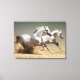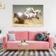 Eine fantastische Szene mit zwei Laufpferden, die Sandwolken auf einer offenen, schlichten Landschaft aufstoßen.