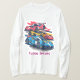 Eine dynamische Komposition von drei Sportwagen, überlappend und überlagert, um ein Gefühl von Geschwindigkeit und Bewegung zu schaffen. Die kühnen Farben und stilisierten Designs rufen die Energie und Spannung der Rennwelt hervor
