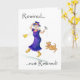 Eine leidenschaftliche Ruhekarte für eine Frau mit Stift und Waschbemalung einer Frau, die beim Glastonbury Festival tanzt und singt (daher die Begrüßungen). Sie hält ein Mikrofon und ein kleiner Hund schließt sich an. Der Text auf der Vorderseite sagt: "Verwired not Remüde". Die Inside Nachricht lautet "Genießen Sie Ihre Pension!".