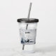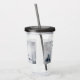 Ein Acryltumbler mit einem Aquarellbild mit einem Rentier aus schwarzer Silhouette, der unter einigen Kiefern stehend ist. Graues Schwarz-Weiß-Farbschema mit neutraler Farbe.