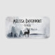 Ein Namensschild mit einem Aquarellbild mit einem Rentier aus schwarzer Silhouette, der unter einigen Kiefern stehend ist. Graues Schwarz-Weiß-Farbschema mit neutraler Farbe.