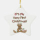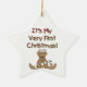 Ein bezauberndes Baby's First Christmas Ornament mit einem Teddybär mit Rentierpflegern und einem Bonbonbonbon und einem kantigen, gestreiften Text mit dem Titel "It's My Very First Christmas".