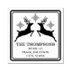 Desteis festliche Silhouette-Design von zwei Rentieren zusammen mit ein paar Schneeflocken. Es gibt auch zwei personalisierbare Textbereiche und das Design ist durch einen gerundeten Rahmen gerahmt.