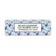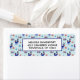 Rücksendeadressen-Aufkleber mit einem sich wiederholenden Muster. Illustriert mit einem blauen skandinavischen Hirsch mit roten Schals. Mit dekorativen Markierungen auf ihren Körpern. Neben einem Trio aus roten und blauen Weihnachtsbäumen mit einem Stern auf der Oberseite. Extravagante Schneeflocken sprengen herum. Ein weißes Rechteck, das oben mit dem personalisierten Text übereinander liegt.