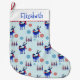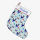 Personalisierter Weihnachts-Strumpf mit einem sich wiederholenden Muster. Illustriert mit einem blauen skandinavischen Hirsch mit roten Schals. Mit dekorativen Markierungen auf ihren Körpern. Neben einem Trio aus roten und blauen Weihnachtsbäumen mit einem Stern auf der Oberseite. Extravagante Schneeflocken sprengen herum.