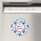 Ein Magnet mit einem sich wiederholenden Muster. Illustriert mit einem blauen skandinavischen Hirsch mit roten Schals. Mit dekorativen Markierungen auf ihren Körpern. Neben einem Trio aus roten und blauen Weihnachtsbäumen mit einem Stern auf der Oberseite. Extravagante Schneeflocken sprengen herum. Ein Kreis lag über dem Muster in der Mitte, in dem steht: Frohe Weihnachten mit einigen blauen Schneeflocken.