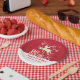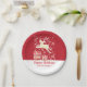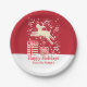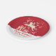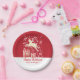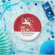 Niedliche Rentiere, die über Weihnachtsgeschenke springen, mit Schnee und Sternen, grafische Weihnachtszeitung-Teller in hellen Rot-, Maronrot-, Gelb- und Weißtönen. Personalisieren Sie mit Ihrem eigenen Familiennamen oder Gruß. Ideal für Weihnachts-Party.