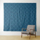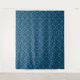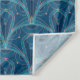 Repeating geometric Art Deco pattern with teal lines and orange dots on a dark blue background, creating a symmetrical and elegant design.