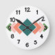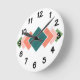 Die Wanduhr hat ein Bauhaus-Design aus sieben sich überlappenden Diamanten, die vertikal entlang des Gegenstands in Retrofarben Blau, Rosa und Grün verlaufen.