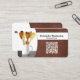 Brown leather sets off the background of this business card design featuring a replaceable on the left with template name and title on the right. The back includes a coordinated design and colors with text fields for the business name and details. Keep or replace the placeholder photo with your vertical format photograph and replace the QR code with yours. Fill in the template fields or use the edit design tool to select a font style, size, and color you like.