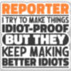 Funny Reporter Redewendungen "Reporter ich versuche, Dinge zu machen idiot Beweis, aber sie Behielt, bessere Idioten zu machen". Nehmen Sie sich dieses komische Reporter-Design als ein lustiges Geschenk für eine phantastische Mutter, einen Vater oder einen Freund.