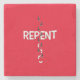 Die Fußabdrücke nach unten durchqueren das Wort REPENT und gehen dann nach oben, um ein Christliches Kreuz zu schaffen.